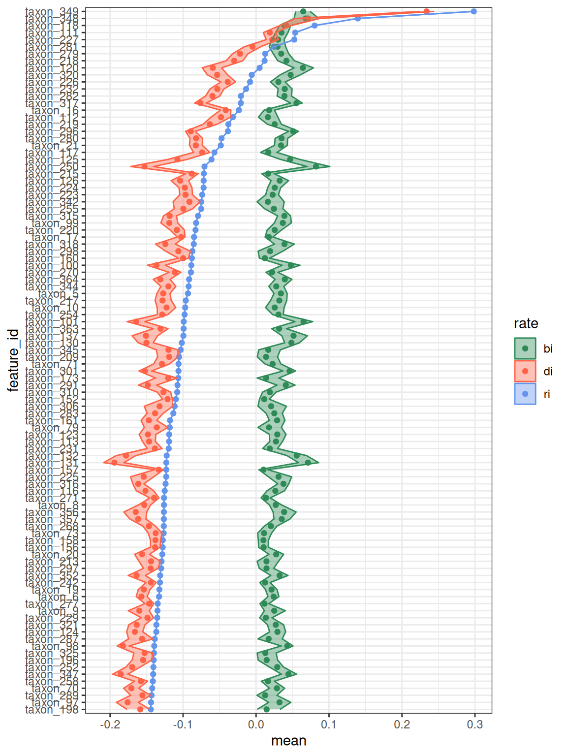 #> Warning: taxon_194Note we get a warning here that taxon_194 has zero abundance at t = 0. Therefore, this feature cannot have a growth rate calculated because any change in abundance would be considered infinite growth.
