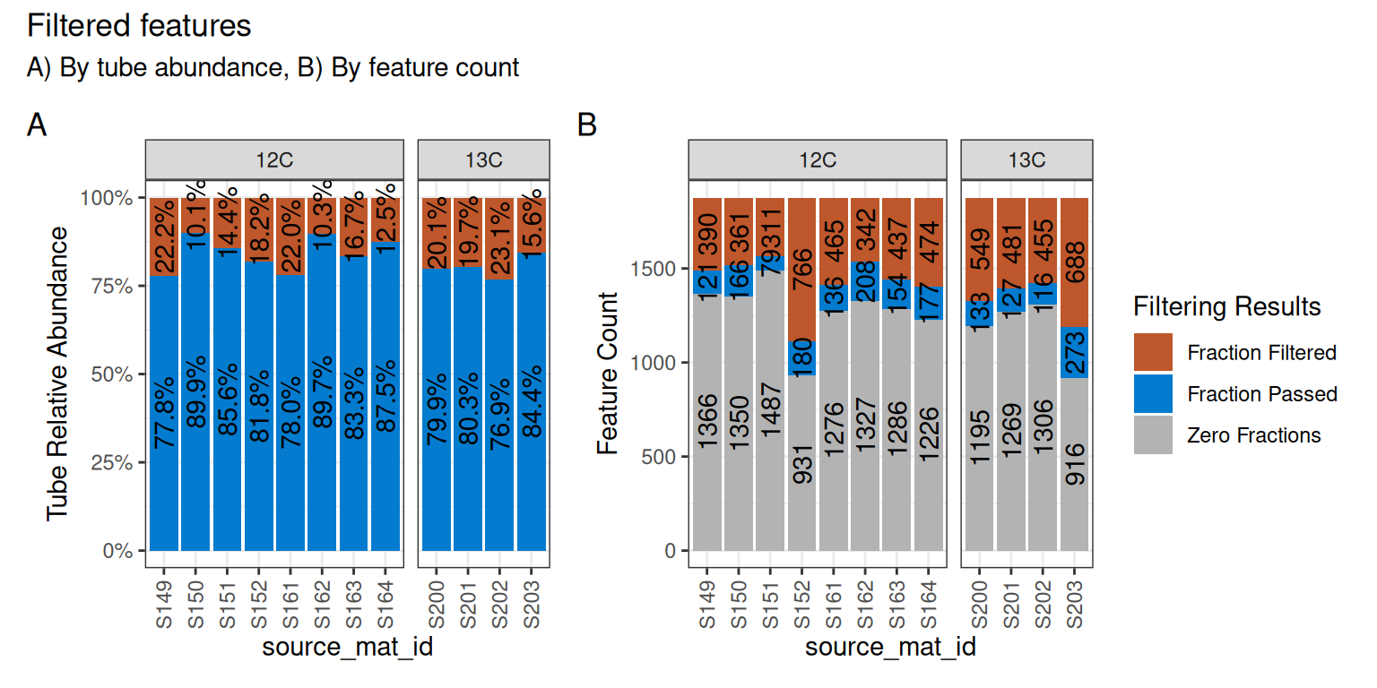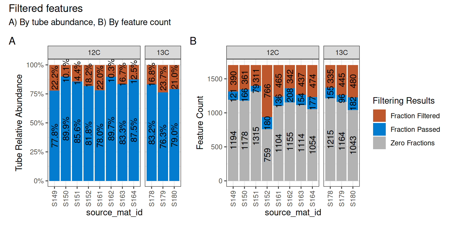 Although a large number of features were removed, we can tell that the 64 that remained actually still make up a large proportion of the total abundance in each sample. In A above, the retained features (in blue) make up ~75-85% of the total data, while the removed data (orange) is the remaining ~15-25%.