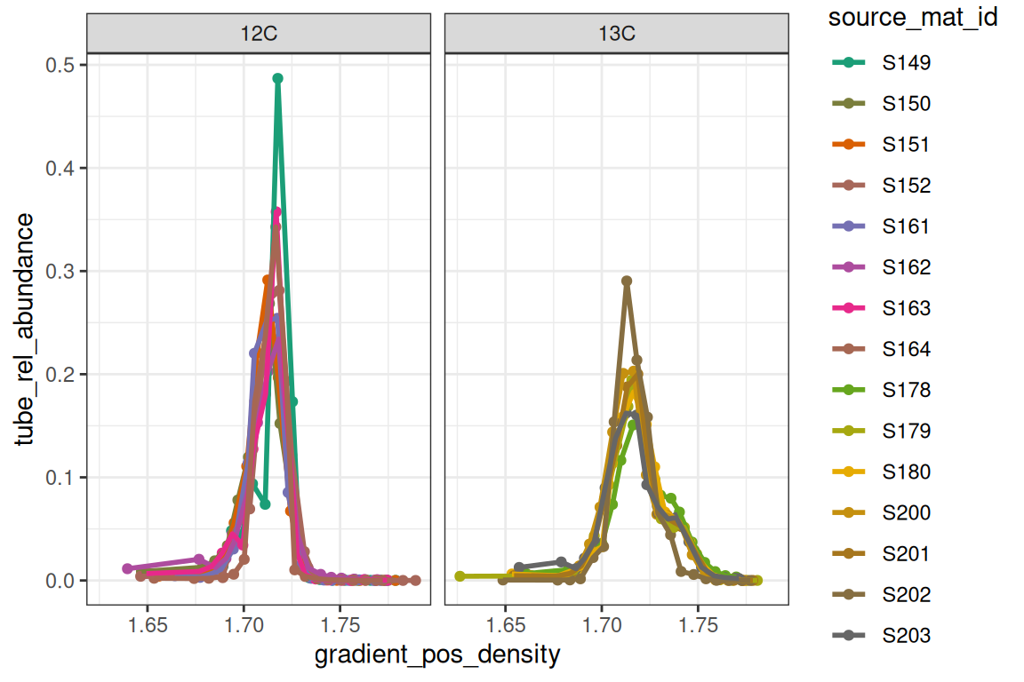An additional column that can be derived is the percent abundance of your total sample that is found in each of the fractions. The add_gradient_pos_rel_amt() function can help calculate that by dividing each fraction abundance by the total abundance for each source and putting it in a gradient_pos_rel_amt column.