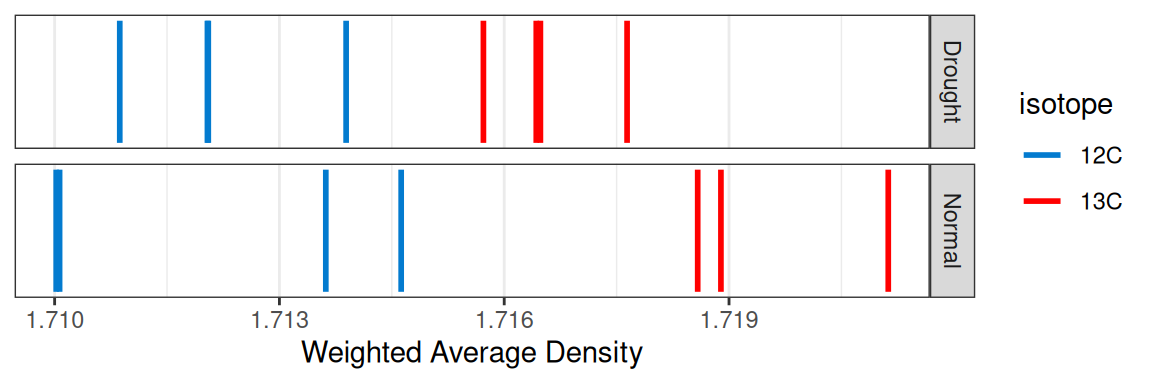 Again, we make a qSIP2 object for this data, this time as a qsip_sample_data object. The columns in the dataframe are assigned to the appropriate parameters, and any column names exactly matching the parameter name will automatically be identified. Similar to the source_data above, the names in the sample_data object will be modified from the original names to the standardized names.