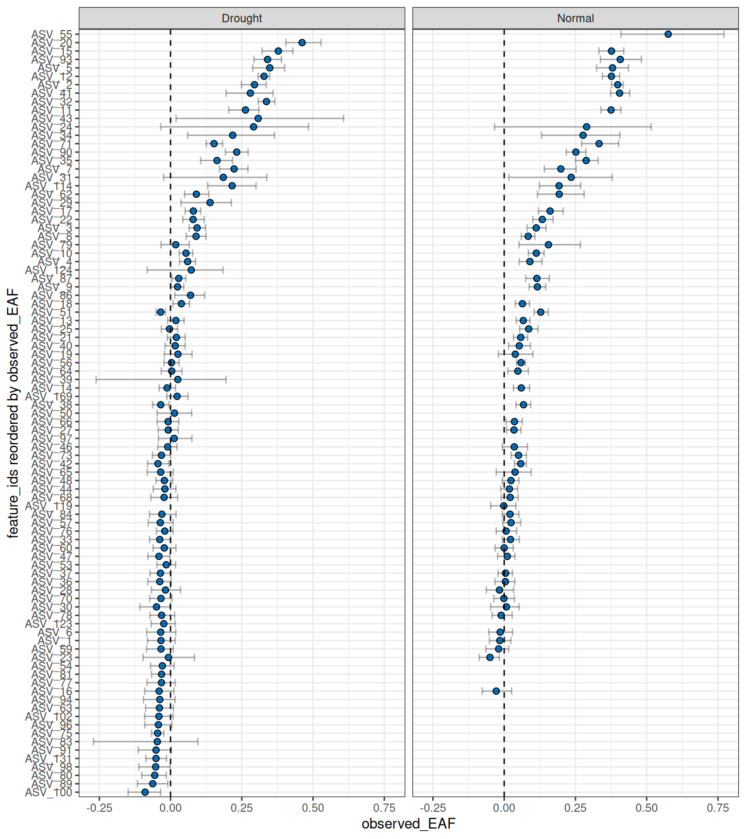 Just looking at a few of these, the delta is the difference in EAF value for those features. Since the function “guessed” the contrasts and set as “Drought vs Normal”, this is saying “Drought” is the control, and the delta is reported as \(Normal - Drought\), so a positive number means higher in the Normal. The lower/upper values are the 95% CI of the bootstrap values, and bs_pval is the p-value under the null hypothesis that the true delta is approximately zero.